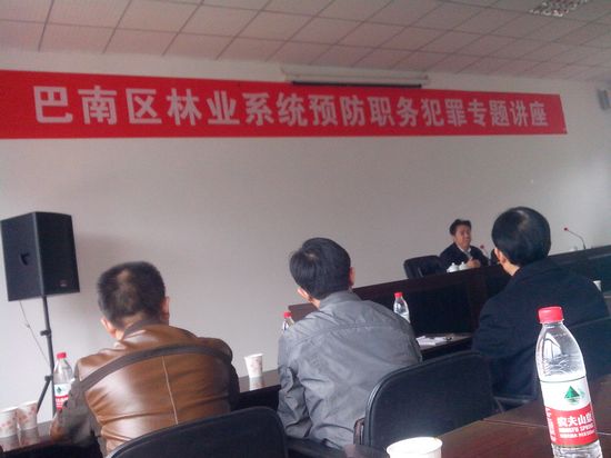 2013年11月13日下午,接龙林场班子成员在巴南区鱼洞金竹开发区武装部打靶场三楼会议室参加了预防职务犯罪专题讲座教育学习。巴南区检察院郭永祥检察长结合身边实际案例,深动讲解了构成职务犯罪的根源、过程及造成的危害,同时结合林业系统工作性质,如何杜绝构成职务犯罪案件的发生,针对性的提出了林业领导干部必须把握的注意事项。启发教育我们事前想后果、衡量利弊大小、算好人生价值帐、保持头脑清醒、理智行事,平安过好幸福人生。